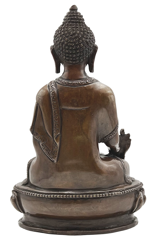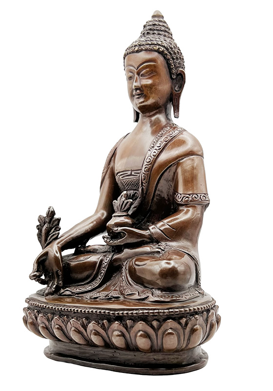 ( Medicine Buddha ) Bhaisajyaguru is known as Medicine Buddha He is also called the Healing Buddha. It is said that he dispenses spiritual medicine when he is worshipped. It is even believed that effective healing can be achieved by merely touching the image. In Tibet, he can be represented as either Buddha or Bodhisatwa. As a Buddha he has the urn (small round bulge or protrusion above the bridge of the nose) the fourth superior sign of a Buddha Ushnisha (A bulged or protrusion in the skull of the Buddha the first superior sign of a Buddha) short and curly hair. He wears a monastic robe, sits with his legs crossed. His left hand, which is in his lap in meditation mudra, usually holds the medicine bowl, while the right hand in charity mudra holds either a branch of fruit or the fruit alone of the myrobalan as a medicinal plant in India and other tropical countries.