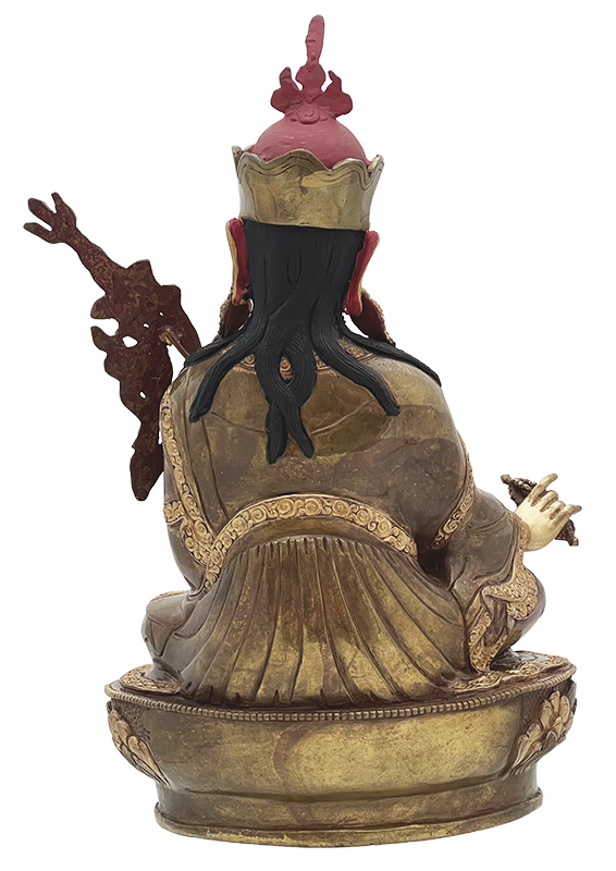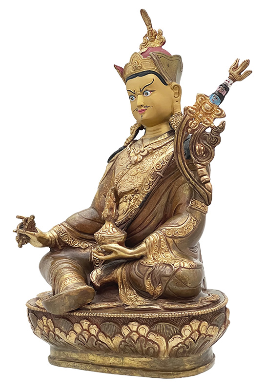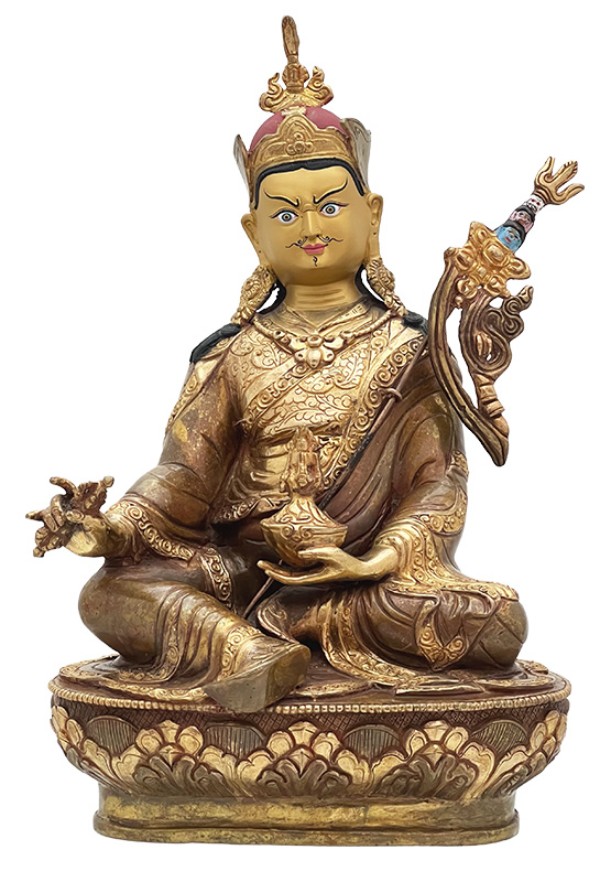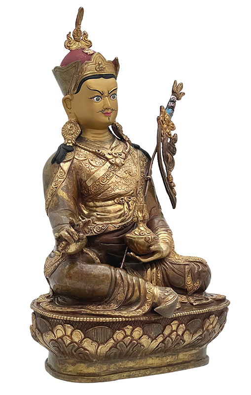 Padmashambha was a famous and very learned Tantric saint from northern India. In the mid-eighth century, the Tibetan king Thi-Siron Detsan was sent to India and invited the learned guru to come to Tibet. Padma Sambhav was known for his knowledge of tantras and their effective use. He stayed in Tibet for 50 years, founded monasteries, and taught tantra. He is said to have subjugated all evil gods in Tibet and only spared those who converted to Buddhism and promised to be defenders (Dharmapala) of the teaching. Padmashambha  in turn promised to enroll them in the Mahayana Pantheon. He claimed to have received from the Dakini the books from which he had acquired his wondrous power. At the end of fifty years, the Padma Sambhav miraculously disappeared. Padmashambha  is shown sitting on a lotus asana, the legs are closed, the right hand holds the vajra, and the left, in his lap, the Patra. He holds his special symbol, the Khatvanga with his left arm pressed against his chest.