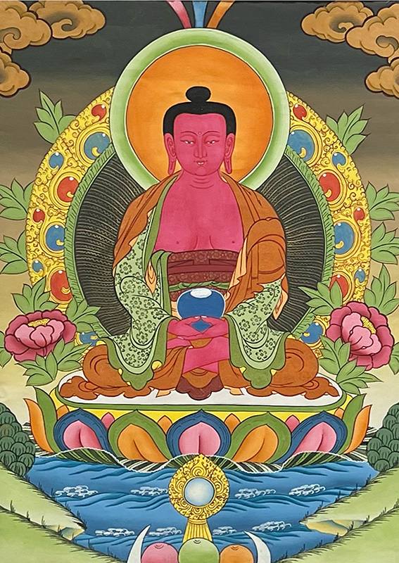 Buddha Amitabha ist der älteste Buddha unter den Dhyani-Buddhas. Er sagte, dass er in friedlicher Meditation im Sukhabati-Himmel leben sollte. Es hat eine rote Farbe, die von der roten Silbe HRIH stammt. Es repräsentiert das kosmische Element von Sanjna (Name). Sein Fahrzeug ist ein Pfau. Er zeigt Samadhi Mudra mit seinen beiden Handflächen auf seinem Schoß. Er hat einen Lotus als Zeichen. Wenn es am Stupa abgebildet ist, ist es immer nach Westen ausgerichtet. Er wird zum Heil verehrt. Manchmal hältst du einen Patra in derselben Position. Amitabha bedeutet „grenzenloses Licht“ oder unverständlich.